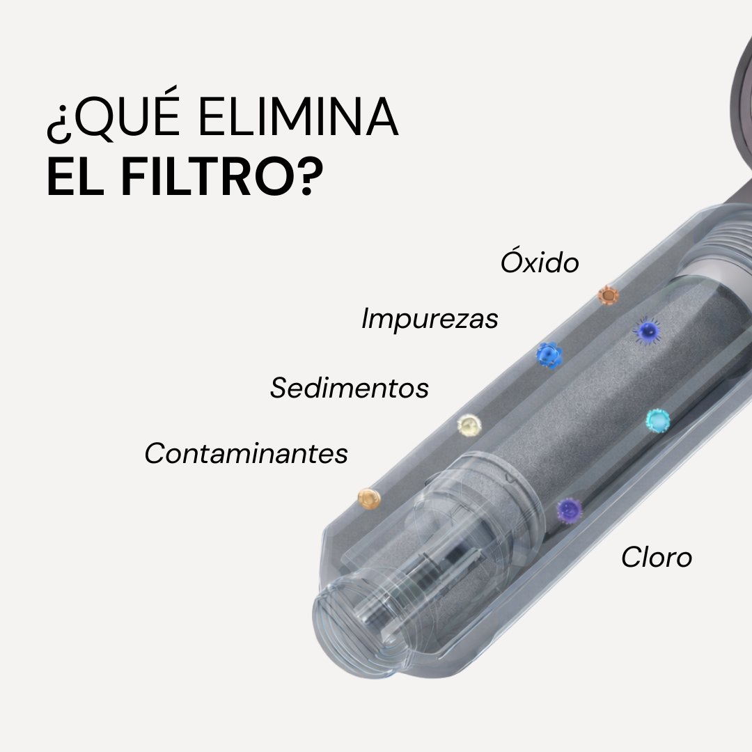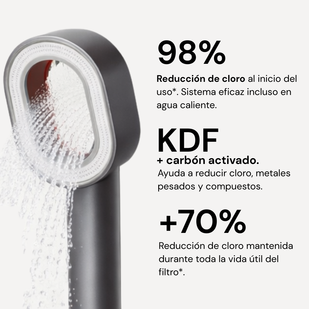 Carbón activado: Contribuye a la reducción de cloro, olores e impurezas, ayudando a mejorar la calidad del agua en contacto con el cuero cabelludo y el cabello.