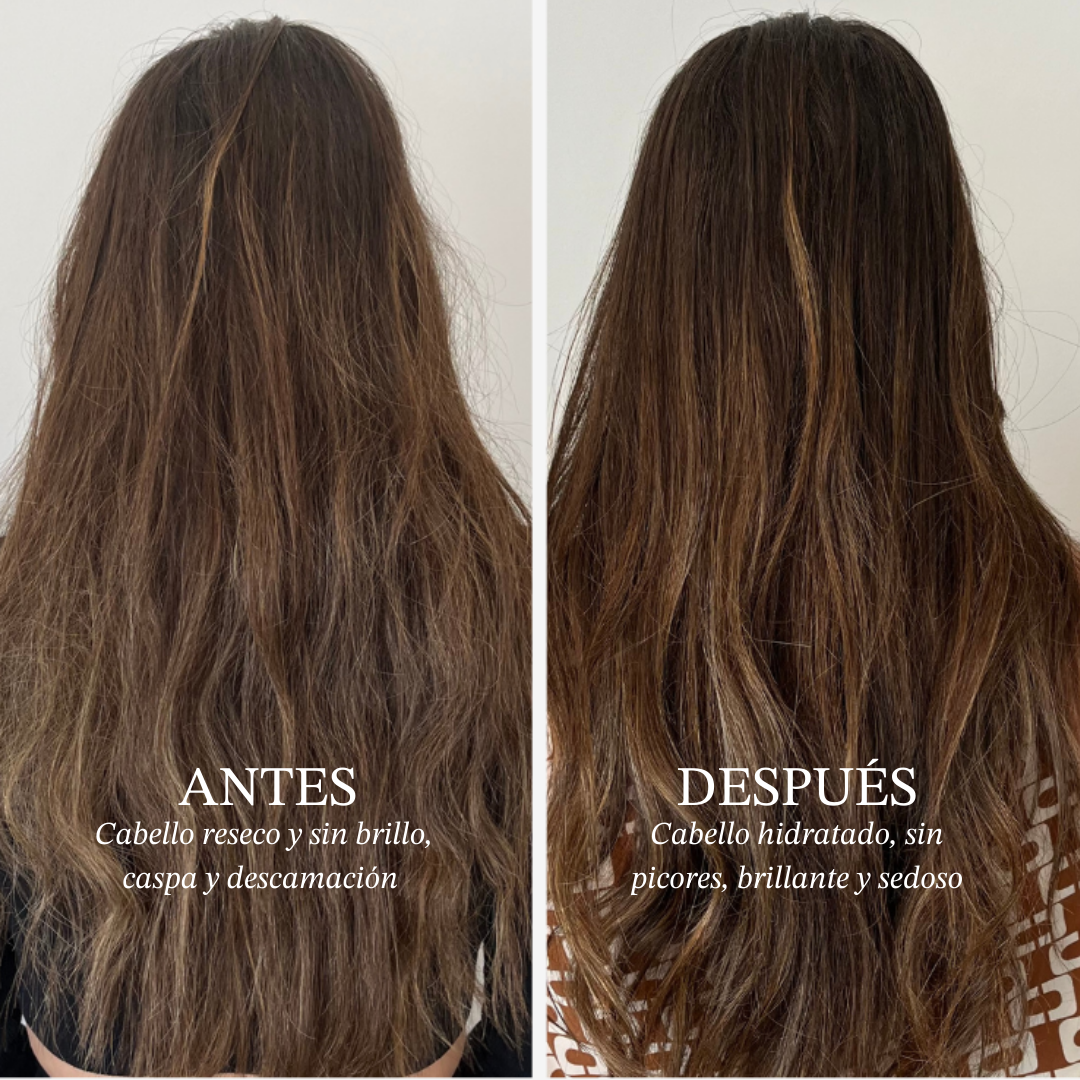 Hidrata, calma, descongestiona el cuero cabelludo y disminuye la descamación